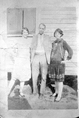 An unidentified man and two women stand outside of a home or building in the 1920s. Location unknown.
