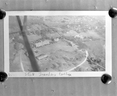 An aerial view of the Jacksonville State Teachers College campus is shown including Abercrombie Hall, Ramona Wood Library, Bibb Graves Hall, Hammond Hall, Daugette Hall and Daugette Annex. (circa 1940s)