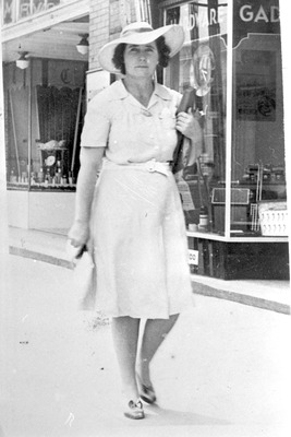 An unidentified female individual walks along the street outside Gadsden Hardware in Gadsden, AL. (circa 1940s)