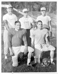 Two Jacksonville State College football players kneel with football coaches Tom Roberson (assistant line coach), Don Salls (head coach), and Ray Wedgeworth (line coach). (circa 1953-1960) [courtesy of Don Salls]