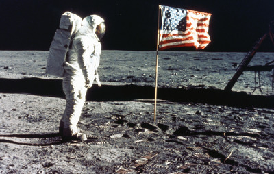 Astronaut Edwin "Buzz" Aldrin stands beside the U.S. flag while on the Moon July 20, 1969 during an Apollo 11 EVA on the lunar surface.