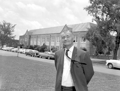 Coach Julian W. Stephenson stands in front of the Jacksonville State College gymnasium. The state legislature passed a resolution in July 1961 to name College Gym the Coach Julian W. Stephenson Gymnasium. "Coach Steve" retired in 1953 after becoming a giant basketball winning coach. (circa July 24, 1961)