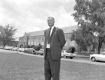 Coach Julian W. Stephenson stands in front of the Jacksonville State College gymnasium. The state legislature passed a resolution in July 1961 to name College Gym the Coach Julian W. Stephenson Gymnasium. "Coach Steve" retired in 1953 after becoming a giant basketball winning coach. (circa July 24, 1961)