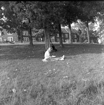 A female student sits on a towel in the grass on campus at Jacksonville State College (now Jacksonville State University). A guitar is propped on a nearby tree. (circa 1960s)
