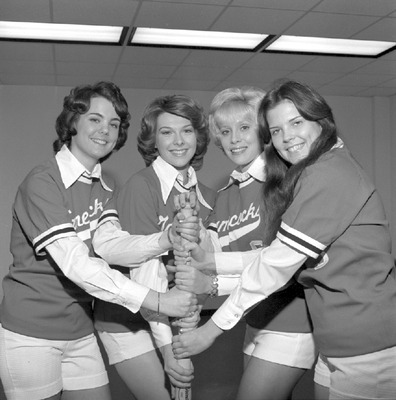 These four female students were "Bat Girls" for the Jacksonville State University Gamecock baseball team in 1975. Shown from left are Ann Jackson, Jan Compton, Angela Poland, Katie Sikes. (circa March 3, 1975)