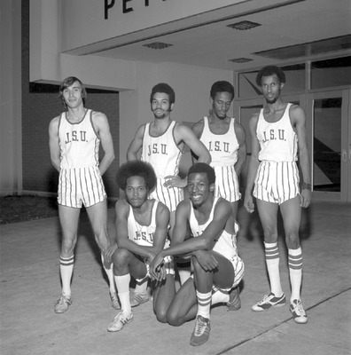 These students were members of the track team at Jacksonville State University. In 1974-1975 they were sprinters. Shown are Melvin Johnson, Michael King, Chris Cunningham, Larry Sledge, Labarron Finch, Preston Buchanon.