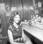 Two female individuals, possibly Jacksonville State University students, gather at a counter full of skin care products. This image may appear in a 1975-1976 football program.