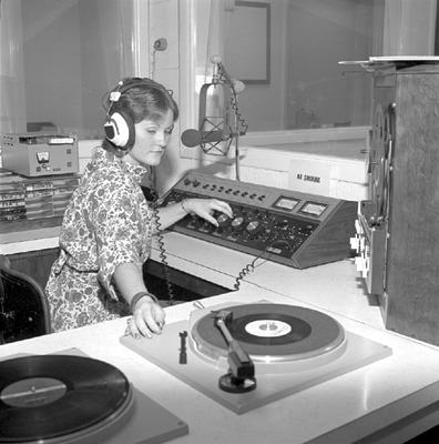 WLJS, student operated FM radio station, aired at Jacksonville State University beginning in September 1975. Graduate student Mike Sandefer was the station manager. The broadcasting tower for the station was located atop the Houston Cole Library, tallest building in the area. Shown is Susan Snow, station disc jockey, at the microphone. (circa September 9, 1975)