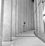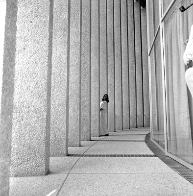 An unidentified female student stands outside Merrill Hall at Jacksonville State University in 1975-1976. (circa August 25, 1975)