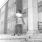 Charlyn Hubbard was a December 1972 graduate of Jacksonville State University. She participated in a 1975-1976 photography session. Shown she stands outside Brewer Hall.