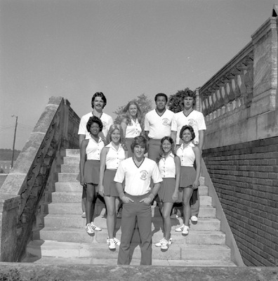 Jacksonville State University 1976-1977 cheerleaders are shown outside on campus. Members were Cindy Shaw, Jurrell Cook (head cheerleader), Teresa McClellan, Cynthia Walker, Cheryl Wright, Don Tate, Wayne Brown, Phillip Whitley, David Bush. (circa August 30, 1976)