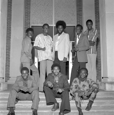 These students were members of the African Students' Organization at Jacksonville State University in 1976-1977. Shown are Alpha Lamin Koroma, Abdul Othoman, Abraham Daramy, Hassan Usman, Abdul Jalloh, Hamilton Lemah, Alexander Idonije, John Akachuky.