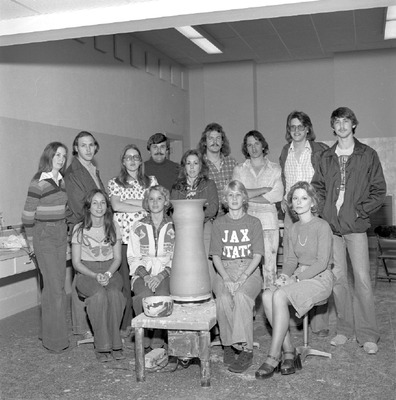 These students were members of the Art Guild at Jacksonville State University in 1976-1977. Shown from left are, first row, Carol Roberts, Sheila Pope, Teresa Jones, Marla Scoggin, second row, Claire De Vore (secretary), Huey Hamilton, Patti Miller (vice president), Marvin Shaw (faculty sponsor), Marsha Williams, Bill McClure (president), James Tatum, Steve Tatum, Mark Coshatt.