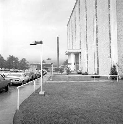 A person walks the sidewalk in front of Sparkman Hall at Jacksonville State University during the 1976-1977 school year.