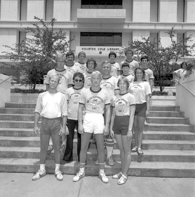 A gymnastics camp was held in Stephenson Gym at Jacksonville State University during Summer 1977. Coach Robert Dillard runs the one week camp for gymnasts ages 10 to 18. Shown camp staff pose together outside the Houston Cole Library. (circa June 27, 1977)