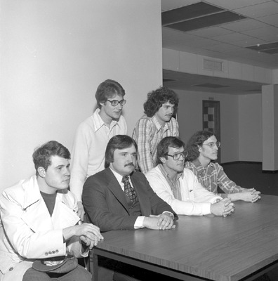 These students were candidates for SGA, Student Government Association, officers for 1977-1978 at Jacksonville State University. Seated are candidates for SGA President. Shown from left are, Lenhardt Fite, Robert Smith, Van Hall, Michael Williams. Standing are Jay Dill (treasurer) and Joe Mucciolo (vice president); whom ran unopposed. (circa March 28, 1977)