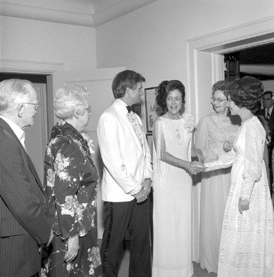 The Alabama Federation of Women's Clubs held its 82nd annual convention May 12-14, 1977 at Jacksonville State University. Shown may be Mr. and Mrs. Robert K. Wilson, Mr. and Mrs. James R. Morrow, and Mrs. Ernest Stone welcoming guests inside the International House. (circa May 12, 1977)