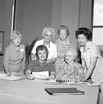 The Alabama Federation of Women's Clubs held its 82nd annual convention May 12-14, 1977 at Jacksonville State University. Shown are club officers or members during a meeting. (circa May 12, 1977)