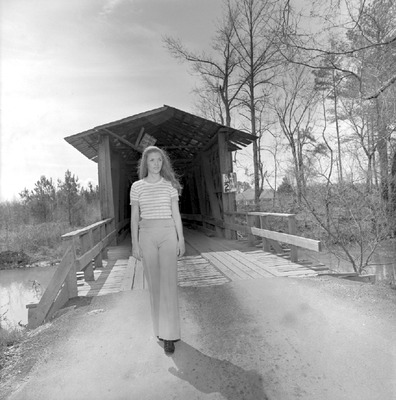 An unidentified female stands on a road posing in front of a covered bridge. Her last name may be Holmes. (circa 1976)
