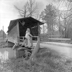 An unidentified female poses on the side of a covered bridge. Her last name may be Holmes. (circa 1976)