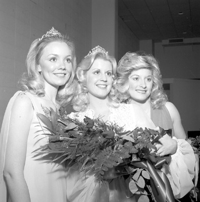 The annual Miss Mimosa Pageant was held January 13, 1977 at Jacksonville State University. Shown from left are Elaine Evans (1977 Miss Mimosa), Barbara Ary (first alternate), and Patti Jayne (1976 Miss Mimosa).