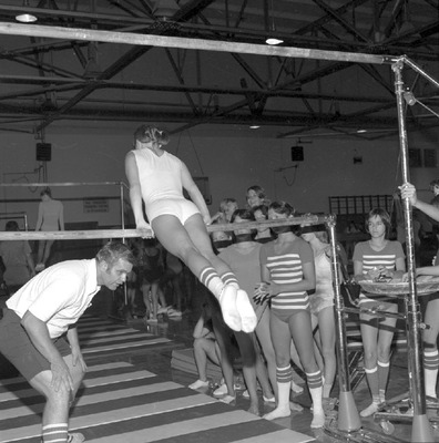 The Physical Education Department at Jacksonville State University sponsored a gymnastics clinic in June 1977 in the old Stephenson Gym. Gymnastics coach Robert Dillard gave instruction to participants during the clinic. Shown is Coach Dillard with participants at the uneven parallel bars. (circa June 20, 1977)