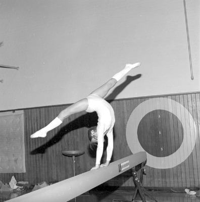 The Physical Education Department at Jacksonville State University sponsored a gymnastics clinic in June 1977 in the old Stephenson Gym. Gymnastics coach Robert Dillard gave instruction to participants during the clinic. Shown is a participant on a balance beam. (circa June 20, 1977)