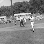 Jacksonville State University baseball action is shown on the field. Identified are Coach Rudy Abbott (running) and Clarkie Mayfield (sidelines). (circa 1976)