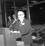 Baseball awards were presented in the Houston Cole Library at Jacksonville State University in 1976-1977. The outstanding athletes of the Gamecock baseball team were honored during the event. Shown Mr. Joe Sewell speaks from the podium.
