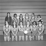 The 1976-1977 women's volleyball team members are shown inside the gymnasium at Jacksonville State University. Shown from left are, front row, Janice Whitaker, Debbie Dunsmore, Deb Lipscomb, Yvonne Gunn, Charlotte Sims, Beverly Cabannis, second row, Barbara Wilson (Coach), Dorothy Grimmett, Teresa Gilliland, Jan Roberts, Sandy Hunter, Sharon Laney (Manager).