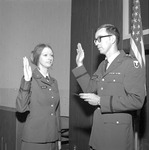 Jacksonville State University held Army ROTC commissioning ceremonies on April 22, 1977 in the Hugh Merrill Building Auditorium. Shown Marguerite Withrow receives the oath from her husband, 1st Lt. Randall Withrow, during her commissioning.