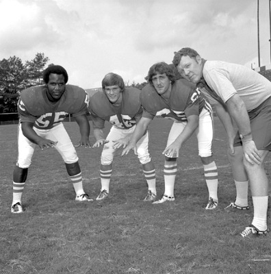 Jacksonville State University defensive coordinator Joe Kines poses alongside 1976 football players on the field. Shown he stands with linebackers Robert Toney, Ray Hammett, and Vince Dilorenzo.