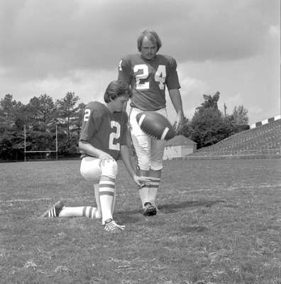 Jacksonville State University 1976 football players pose on the field with a football. Shown are Rocky Riddle (kicking specialist) and Ronnie Lawson (kicker).