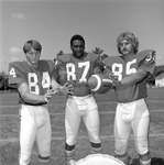 Jacksonville State University 1975 football players pose on the field with a football. Identified may be Wallace Wiggins. (circa 1975)