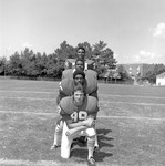 Jacksonville State University 1975 football players pose on the field. Identified players may be Mike Baxter and Jimmy Terrell.