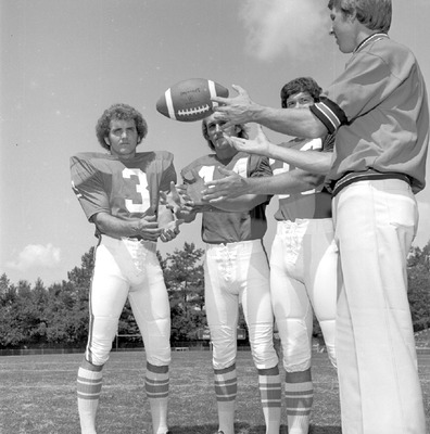 Jacksonville State University defensive backs coach Bobby Marcum poses alongside 1975 football players. Identified players may be Lefty Perry, Kim Porch, Jimmy Cox.