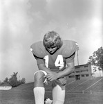 An unidentified Jacksonville State University 1974 football player kneels on the field.