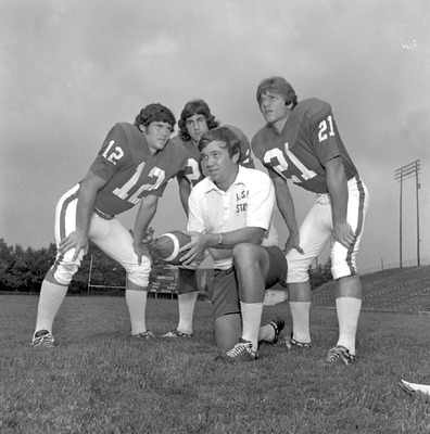 Jacksonville State University head football coach Clarkie Mayfield kneels alongside 1974 football players. Identified players may be Ken Calleja and Mike Hobson.