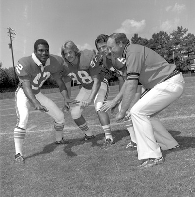 Jacksonville State University defensive line coach Tommy Simpson poses alongside 1975 football players on the field. Identified are Henry Studyvent and Jimmy Terrell.