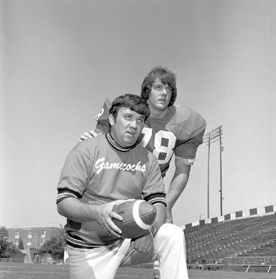 Jacksonville State University head football coach Clarkie Mayfield kneels alongside 1975 football player Calvin Word.