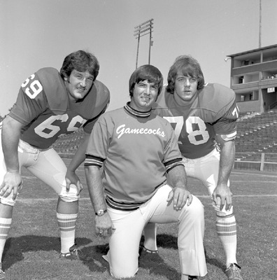 Jacksonville State University offensive line coach Jimmy Champion kneels alongside two 1975 football players. They may be Greg Watts and Calvin Word.