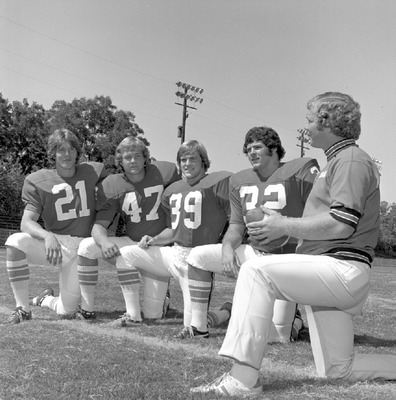 Jacksonville State University offensive coordinator Jim Fuller poses alongside 1975 football players. Identified players may be Mike Hobson, Keith Martin, Amos McCreary, Allen Stevenson.