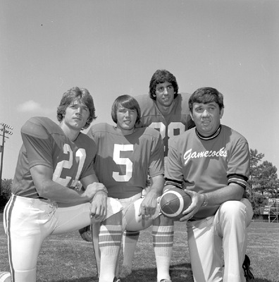 Jacksonville State University head football coach Clarkie Mayfield stands alongside a group of 1975 football players on the field. Shown are Mike Hobson, Larry Barnes, Ken Calleja, and Coach Mayfield.