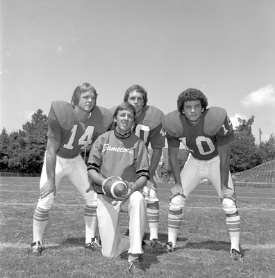 Jacksonville State University defensive backs coach Bobby Marcum poses alongside 1975 football players. Identified players may be Jay Graham, Marty Morelle.