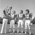 Jacksonville State University defensive backs coach Bobby Marcum poses alongside 1975 football players. Identified players may be Jay Graham, Marty Morelle.