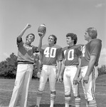 Jacksonville State University defensive backs coach Bobby Marcum poses alongside 1975 football players. Identified players may be Jay Graham, Marty Morelle.
