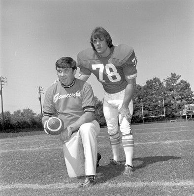 Jacksonville State University head football coach Clarkie Mayfield kneels alongside 1975 football player Calvin Word.