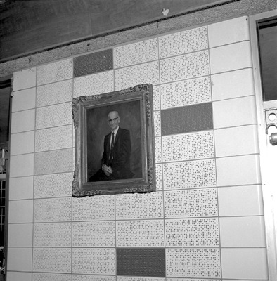 A framed painting of J.M. (James Marvin) Anders hangs inside Anders Hall at Jacksonville State University in 1976-1977. Dr. J.M. Anders was the head of the History Department before his retirement in 1968.