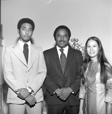 The Jacksonville State University International House celebrated United Nations Day with a tea and open house on October 24, 1976. Shown are International House program students and guests. Identified are Rene Morris (Panama) and Thao Nguyen (Vietnam). (circa October 24, 1976)