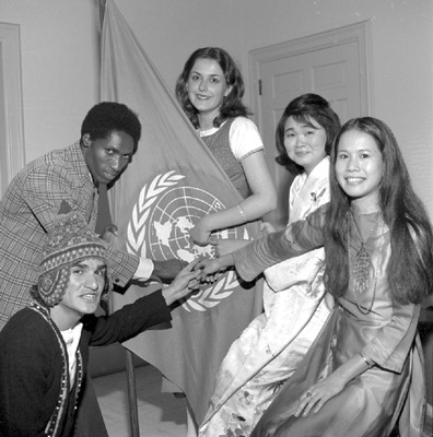 The Jacksonville State University International House celebrated United Nations Day with a tea and open house on October 24, 1976. Shown with the United Nations Day flag are Alberto Ruiz (Peru), Harrison Kago (Kenya), Elisabeth Sturm (Austria), Masako Kinoshita (Japan), and Thao Nguyen (Vietnam). (circa October 22, 1976)